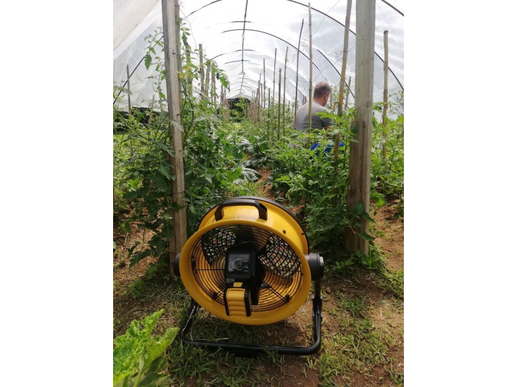 Profesionální ventilátor DFB 16 s max. průtokem vzduchu 1200 m3/hod, průměrem 40cm, plynulou regulací výkonu a s možností napájení 230V /AKU.